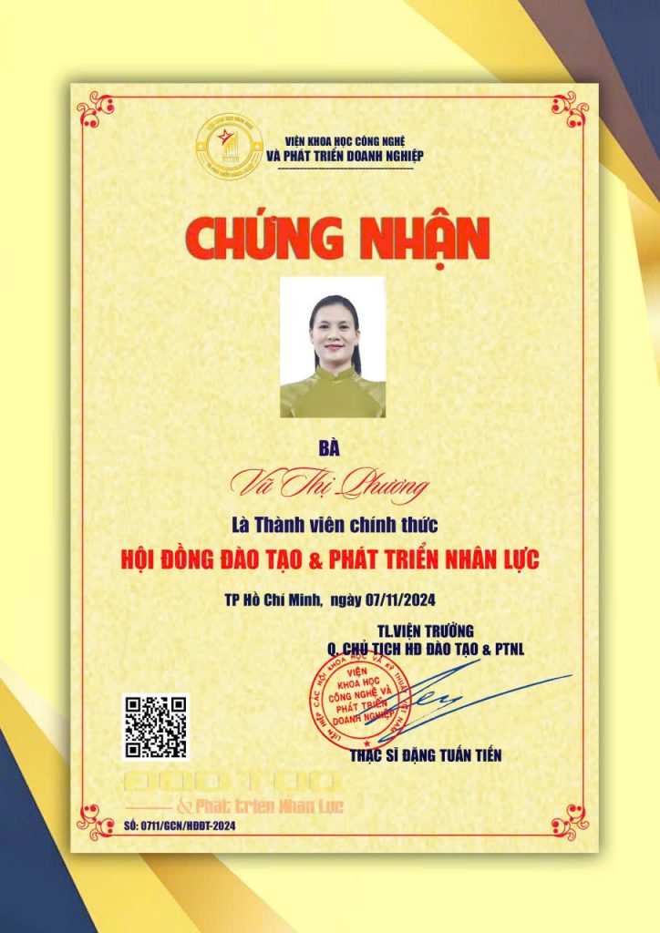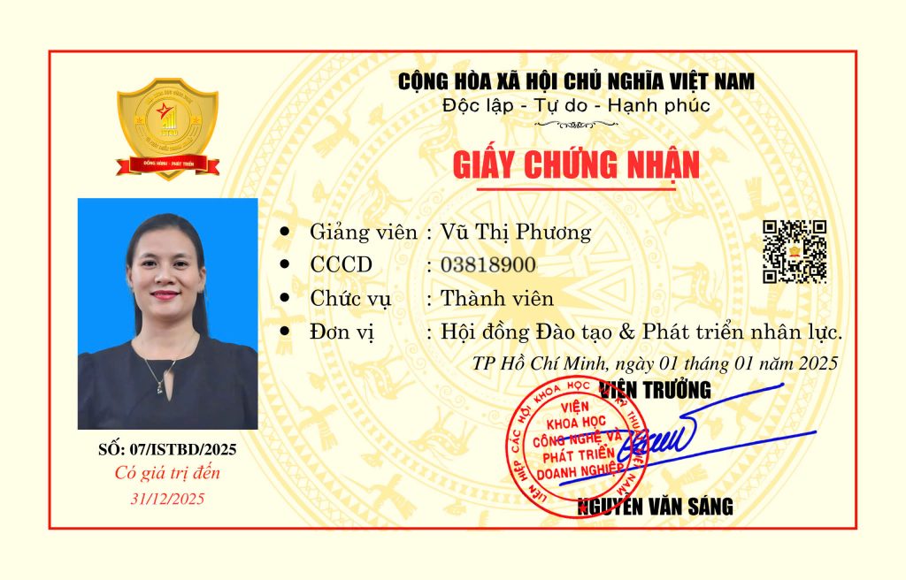 Giảng viên Vũ Thi Phương, tốt nghiệp Đại học Đồng Nai chuyên ngành Kế toán Doanh Nghiệp, có hơn 12 năm kinh nghiệm quản lý nhân sự tại các doanh nghiệp lớn như Tập đoàn Thiên Nam, Công ty Globalcare.
